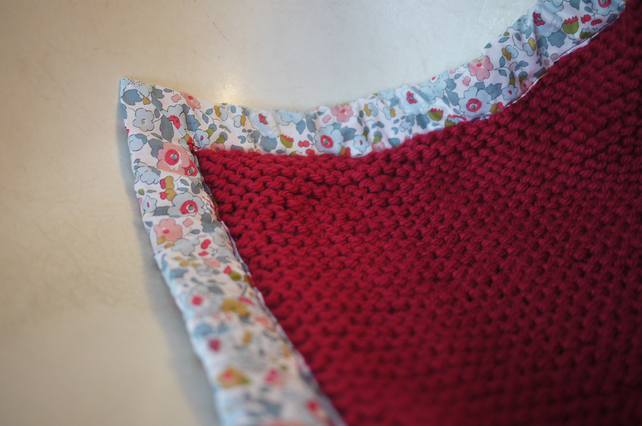 Pour la doublure, j’ai choisi un tissu liberty du marché Saint-Pierre dont certaines fleurs rappellent la couleur framboise de la laine! le Tuto pour faire la doublure en tissu est ici, très facile aussi pour moi qui ne suis pas une as de la machine à coudre!