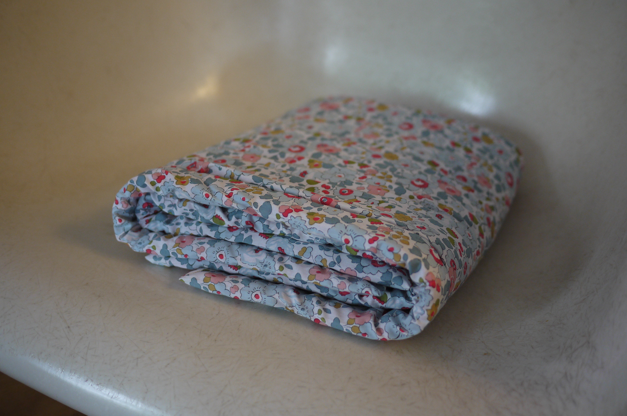 Ensuite pour coudre la polaire ensuite utilisez de fil à coudre simple (pas de laine) l’idéal étant de le faire à la machine (plus rapide! Si vous voulez que la laine « colle » bien au tissu polaire vous pouvez faire quelques points au centre et sur les diagonales de l’ouvrage, ça tiendra bien ainsi! Enfin pour les bords en Liberty vous pouvez utiliser la technique mentionnée dans mon billet