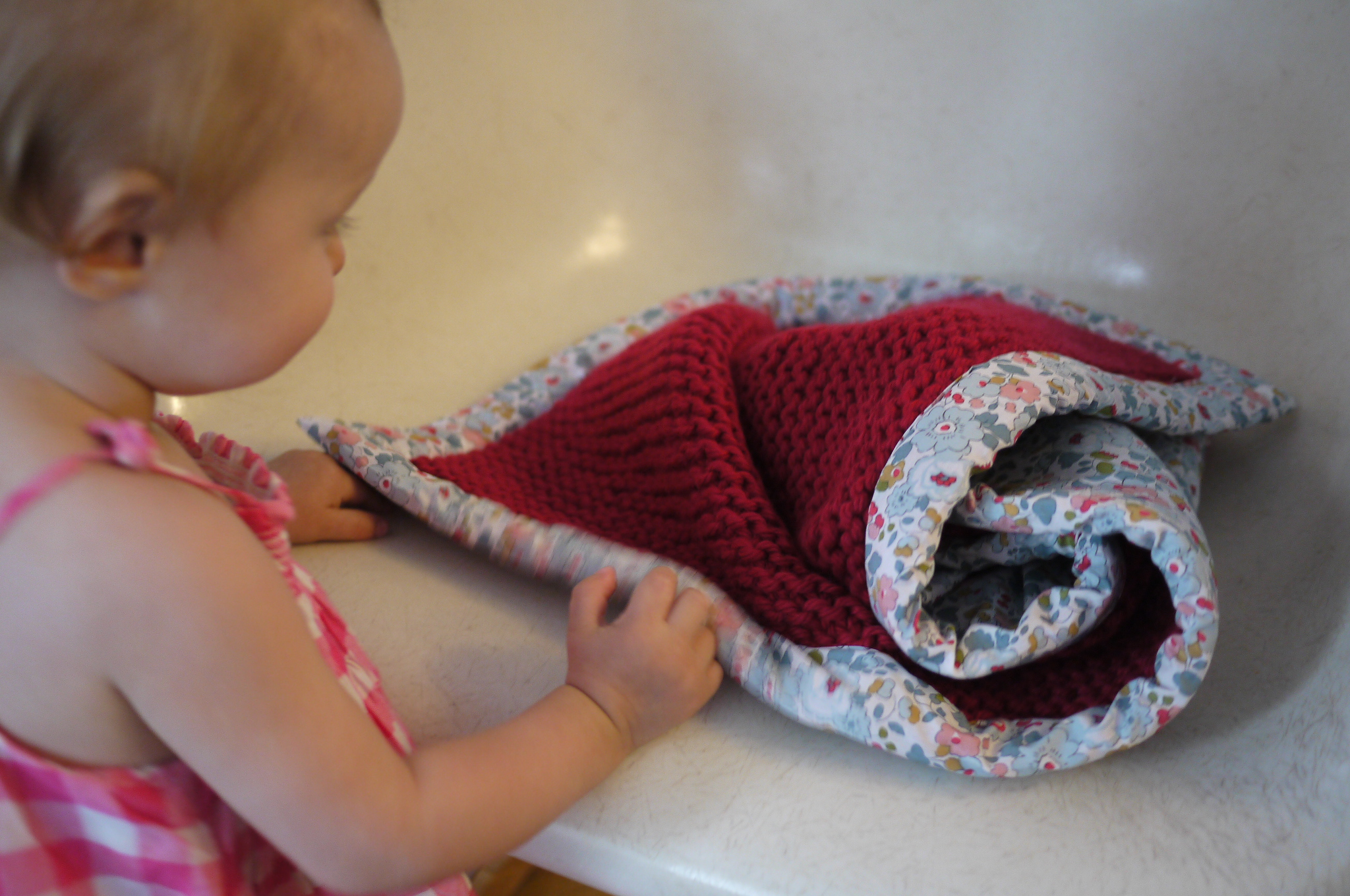 J’avais donc réalisé le plaid « baladou », mais sa réalisation m’avait semblé suuuuuuper longue (je rappelle ma patience légendaire). Il consistait en 9 bandes de 64 cm à tricoter en jersey et à coudre ensuite avec 8 bandes de tissu coordonné…bref, résultat plutôt réussi sur un côté mais pas de doublure prévue pour l’autre côté, donc même si c’est ce petit plaid que j’ai utilisé pour couvrir Ma Petite dans son cosy en sortant de la maternité, au final j’étais restée un peu sur ma faim.