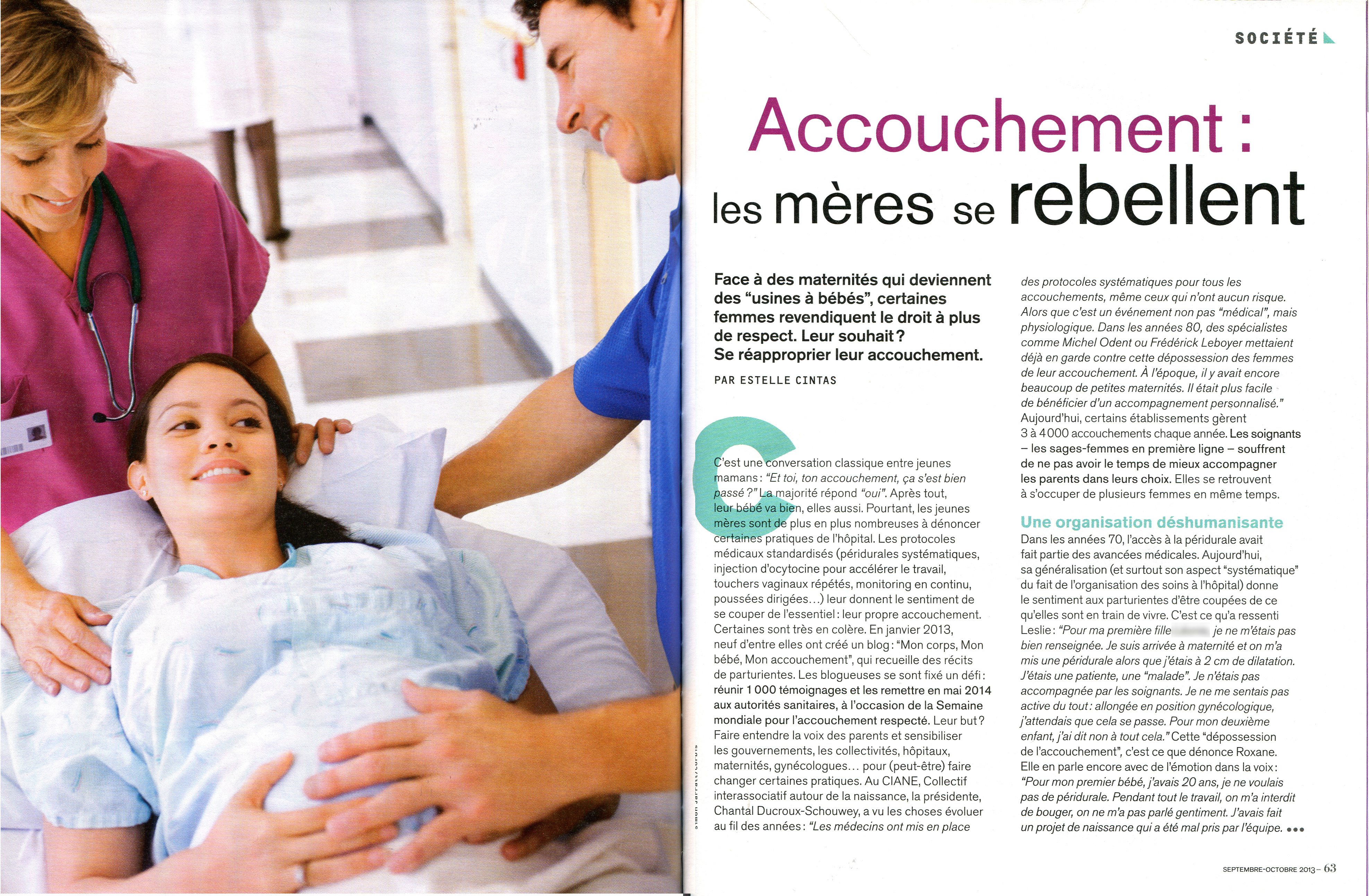 Cette conférence a également été l’occasion pour moi de partager mon expérience lors des questions/réponses en fin de conférence. C’est a l’issu de cet échange que la journaliste Estelle Cintas m’a sollicitée pour participer à un futur article pour son magazine « info bébé/info crèche » sur le thème « accouchement: les mères se rebellent », nous avons convenu d’un RDV téléphonique et échangé longuement sur mon expérience et ressenti suite à mes deux accouchements très différents l’un de l’autre. J’ai reçu la semaine dernière par la poste le magazine de septembre dans lequel apparaît mon témoignage, tout à fait fidèle aux échanges que j’ai eus avec la journaliste, je le partage ici avec plaisir (il faut cliquer sur les deux photos de l’article pour les agrandir)!