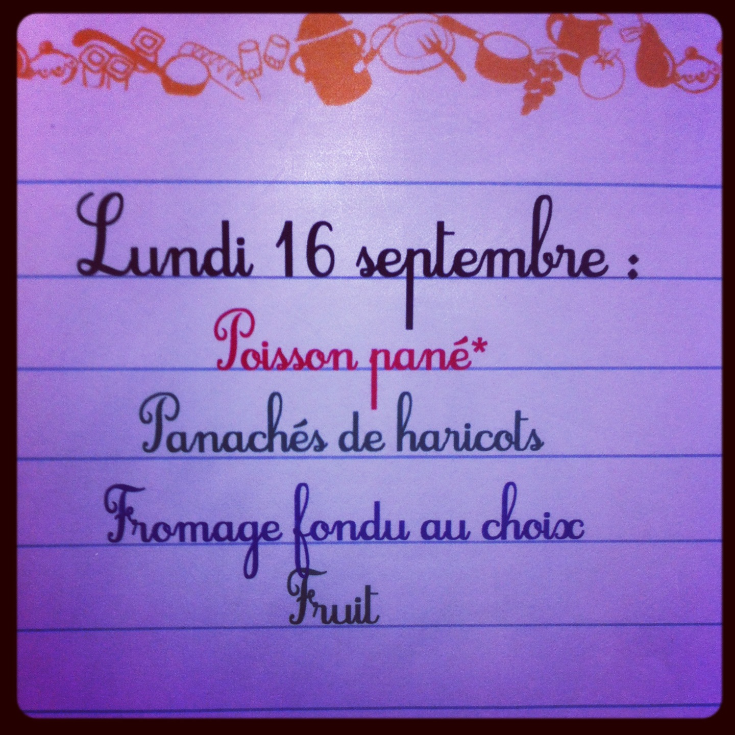 hum, elle a donc mangé « du poisson rose au poulet », cela me semble un brin louche! Après vérification sur le menu affiché à l’école, elle a effectivement mangé du poisson pané (qui avait peut-être un goût de poulet en même temps ce n’est pas très rassurant mais c’est possible, non ?!?!).