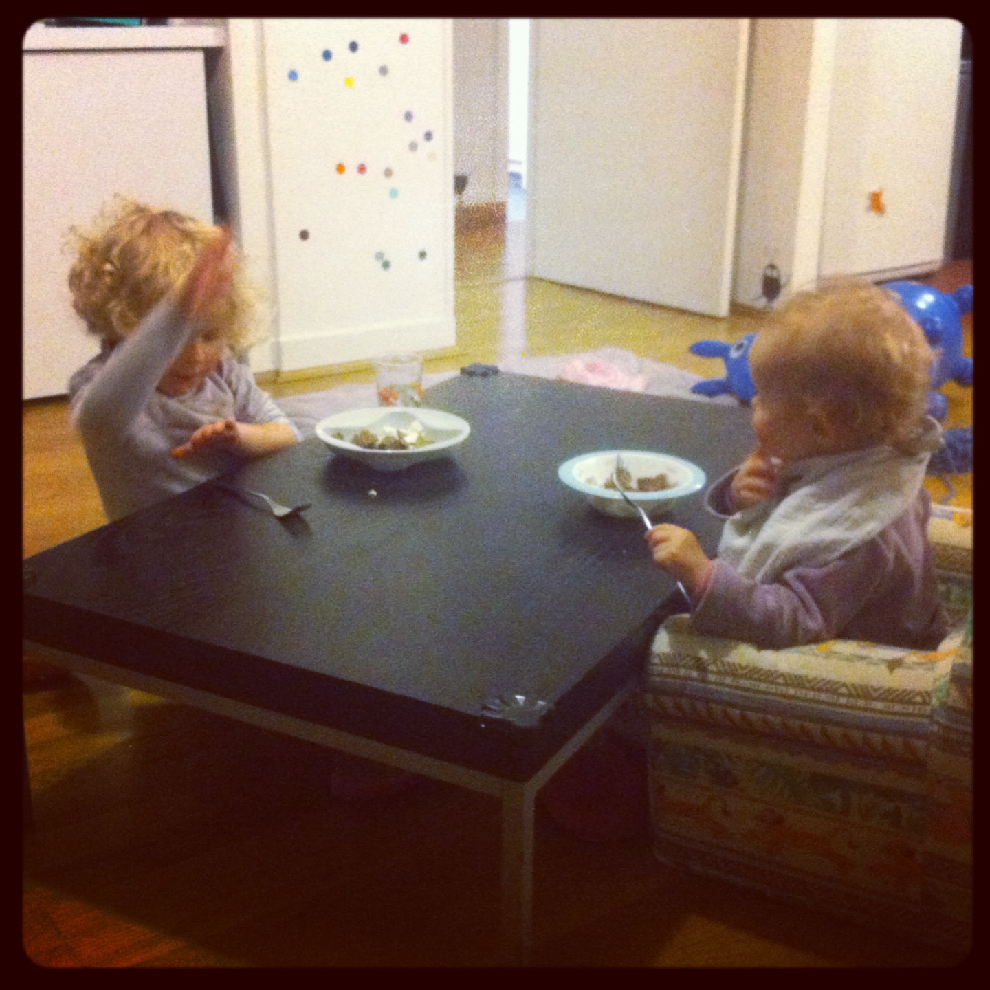 – pour finir la journée, les filles ont dîné tranquillement toutes les deux autour de la table basse, j’adore les voir « discuter », même si Ma Petite ne parle pas encore vraiment, elle semble comprendre tout ce que lui dit sa grande soeur et y porter un très grand intérêt!
