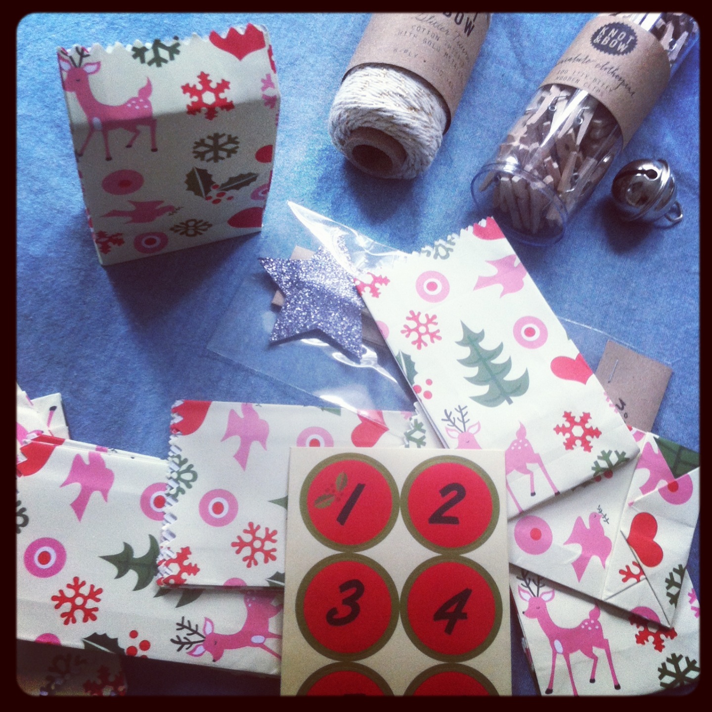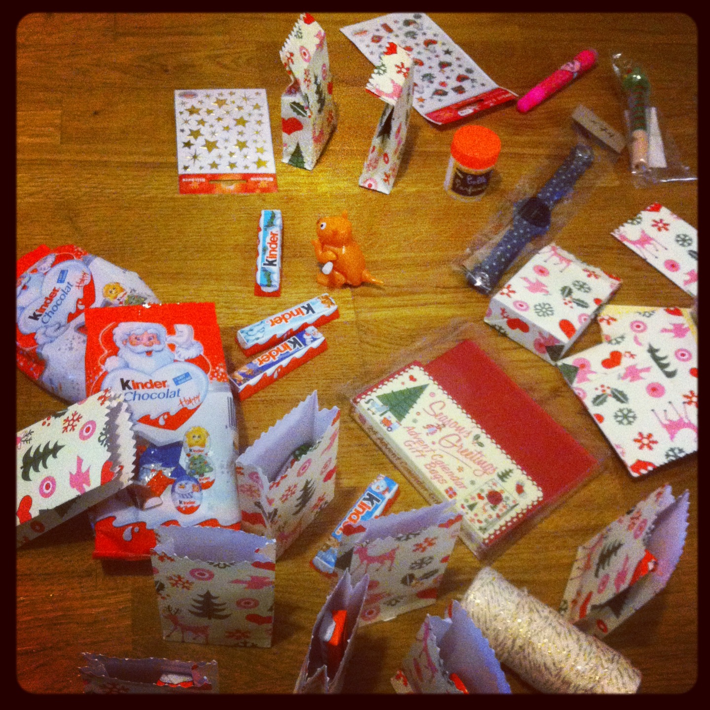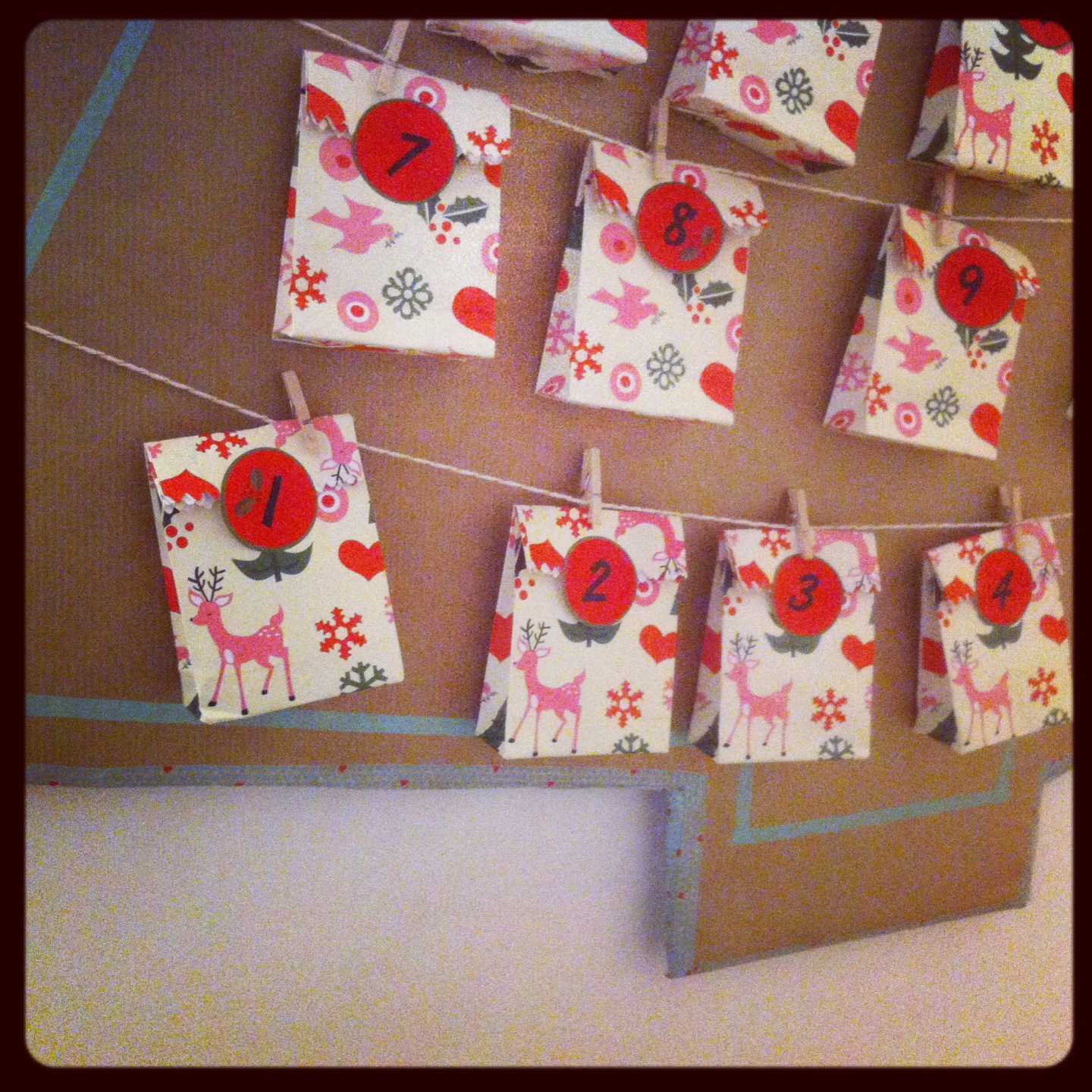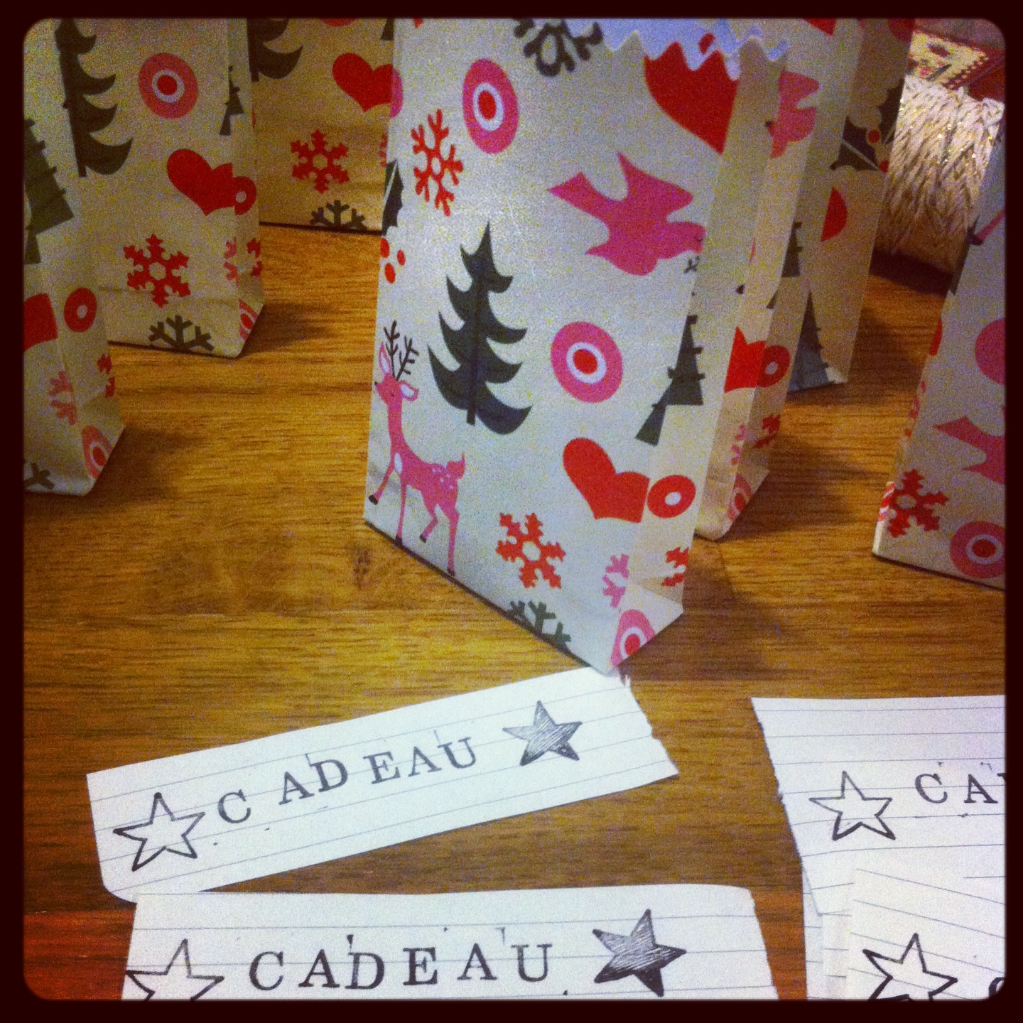 Un grand carton, du papier kraft, du joli fil doré, du masking tape, des mini pinces à linge et des petites pochettes trouvées dans la boutique de jouets et de goodies proche de chez moi « Caprices et comédies », et le tour était joué! J’ai rempli les pochettes avec des chocolats (des Kinder bien sûr!!!) et mis des petits bons pour des mini-cadeaux achetés dans la boutique/librairie « Le dragon savant » (un sifflet sapin, des feutres, des gommettes de Noël, un tube de colle qui sent l’amande, une baguette magique, un baume à lèvre…)