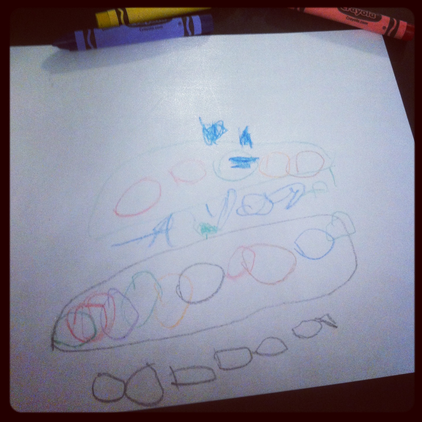 Après le dessin du bonhomme, elle a eu envie de dessiner autre chose avec ses nouveaux crayons gras Crayola. Deux bateaux, un grand et un petit, tous les deux avec plein de hublots et deux mini-voiles toutes toutes petites (une bleu et une verte)! En dessous des bateaux, les ronds noirs et bleus représentent des poissons!