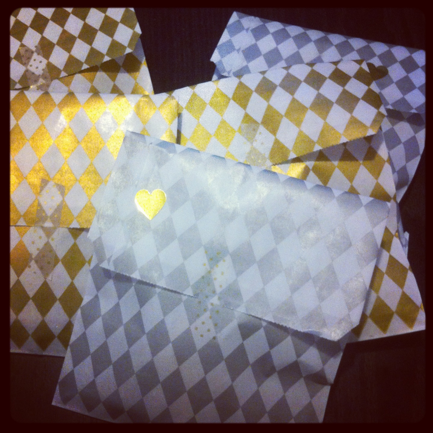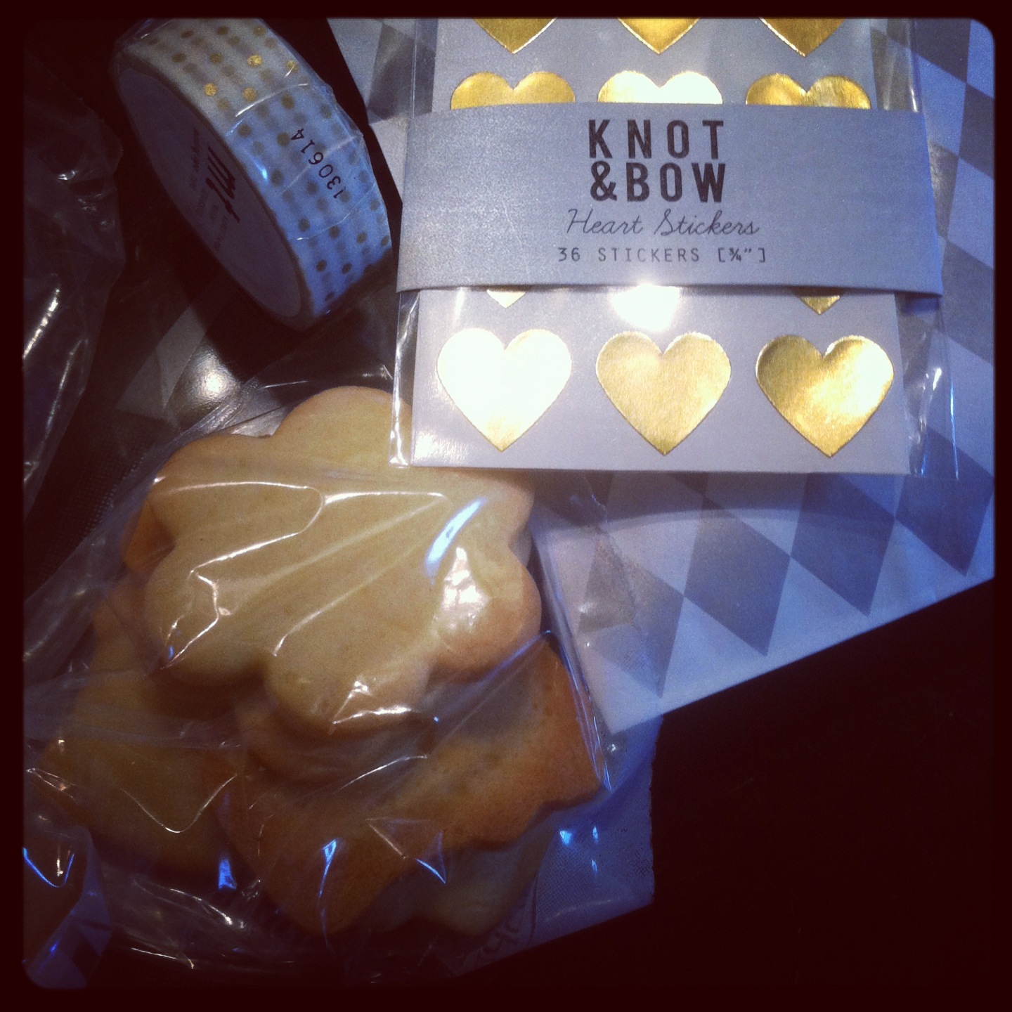 Pour faire des petites surprises à nos convives pour Noël, nous nous sommes mises aux fourneaux avec Ma Grande pour leur préparer des petits sablés de Noël! … Nous n’avions pas prévu d’emporte-pièces de Noël, donc nous avons fait des jolis nuages-fleurs et des personnages Hello Kitty (que Ma Grande adooooore!!!) puis nous avons empaqueté le tout dans de jolis sachets dorés et argentés.