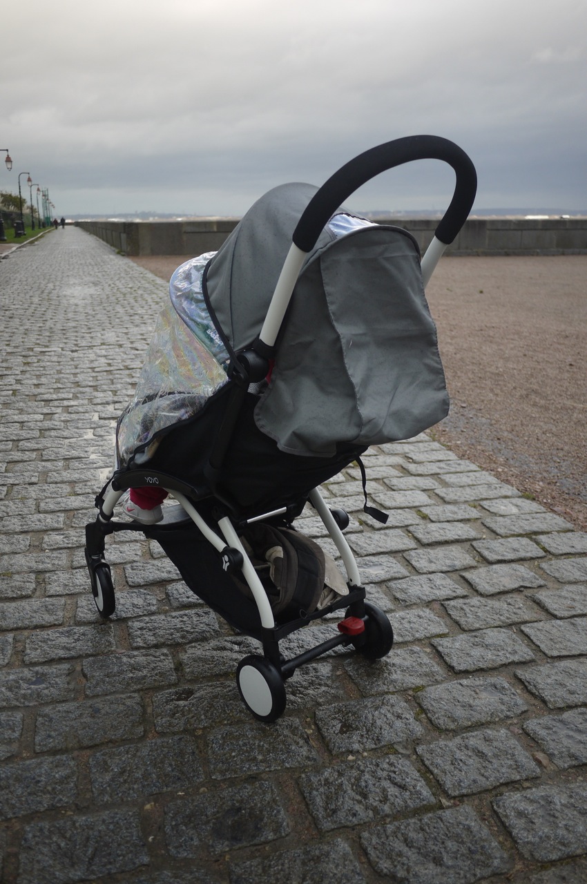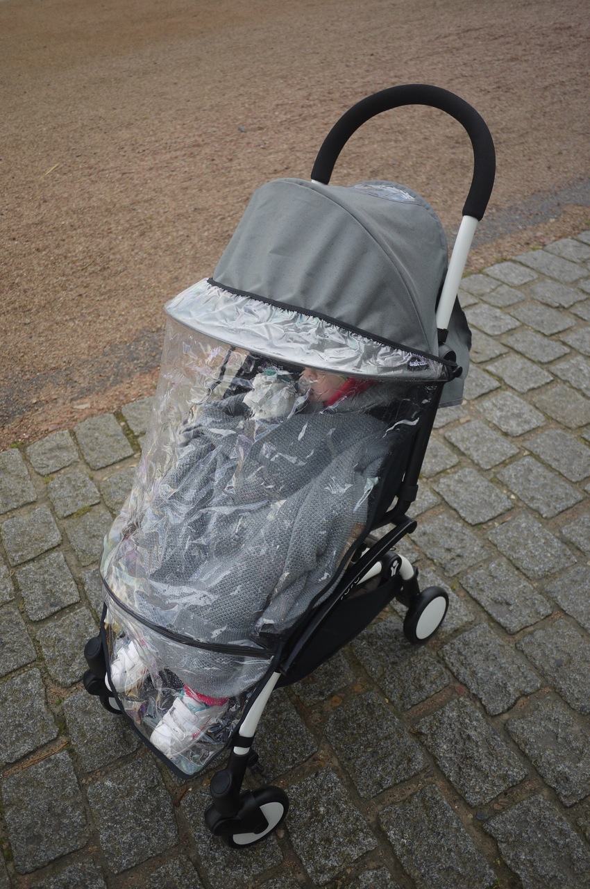 – La cape de pluie est pratique, rangée dans un petit pochon facile à transporter, un peu moins facile à attacher que celle de la MacLaren (qui avait des encoches prévues exprès pour l’attacher à la poussette) mais pas très compliqué tout de même!