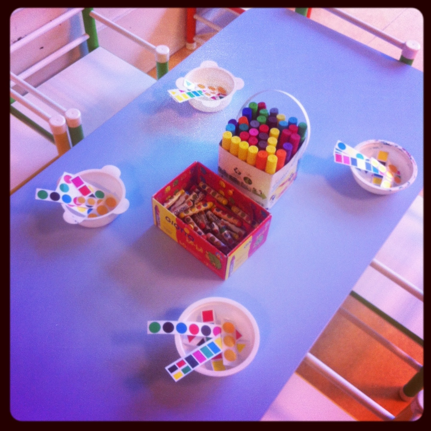 – un gros pot de crayons et de feutres, dans lequel j’ai pioché pour prendre un feutre rouge, jaune, bleu, vert que j’ai ensuite posés dans leurs petits pots individuels.