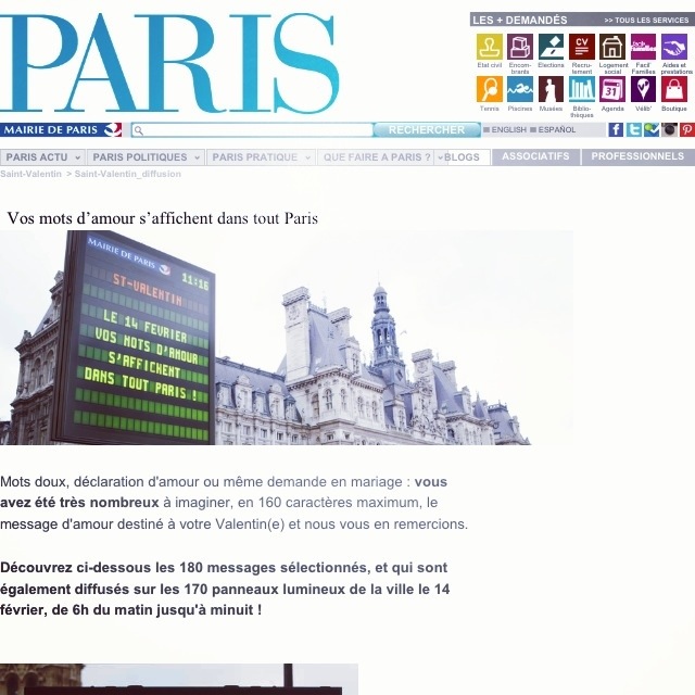 Ce matin j’ai eu une jolie surprise, point de bague ou de fleurs mais un petit email m’invitant à aller lire le site de la Mairie de Paris, j’y ai découvert le plus joli des mots doux…