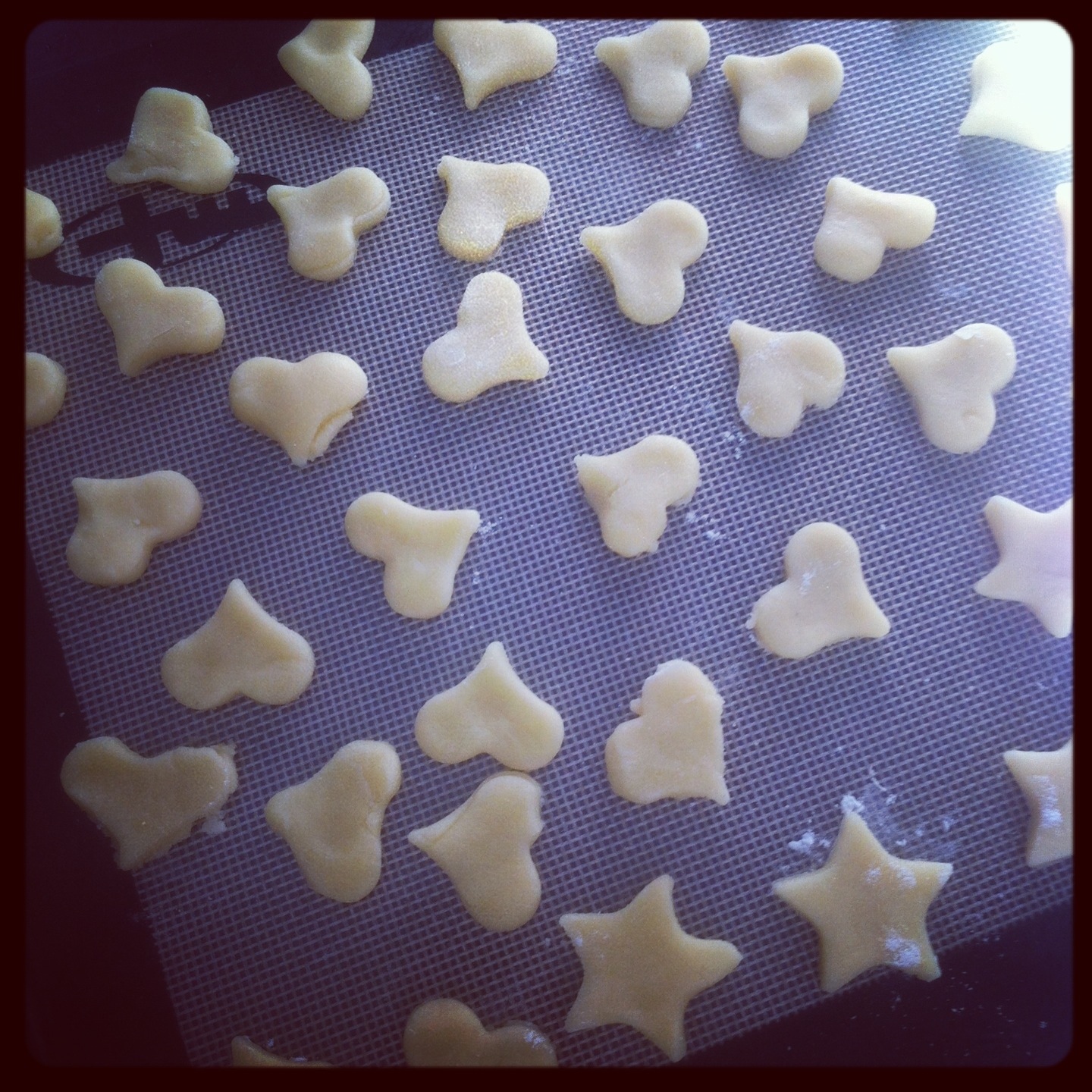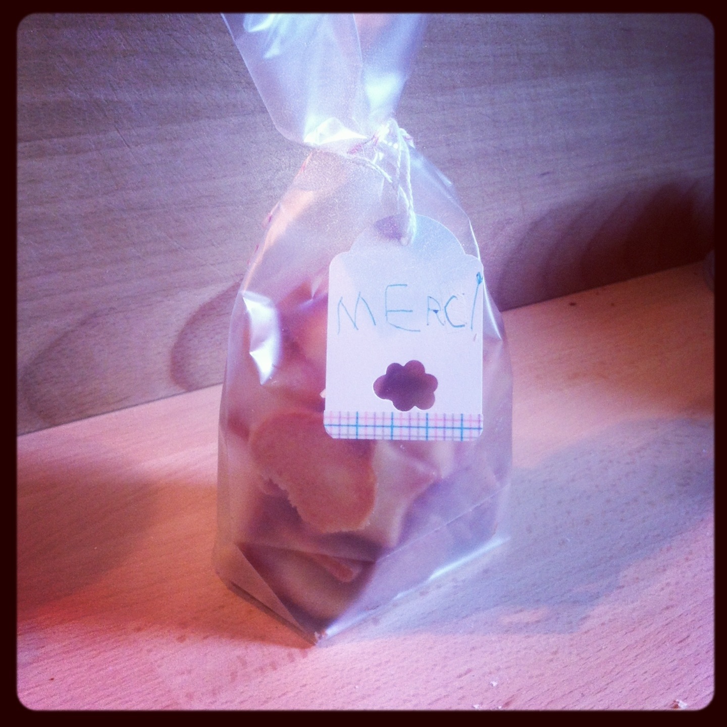 J’avais aussi prévu de confectionner des petits sachets contenant quelques gourmandises préparées avec Ma Grande: cannelés, meringues et roses des sables en chocolat! … Mais depuis deux jours il fait 30 degrés à Paris… Autant dire que mes confiseries ne résisteront pas à la chaleur! En farfouillant sur le net ce matin je suis tombée sur cette jolie idée de Wonderful Breizh qui m’a rappelée nos confections de petits gâteaux de Noël. J’avais acheté des jolis sachets et hop après un petit atelier avec Ma Grande voilà le résultat!