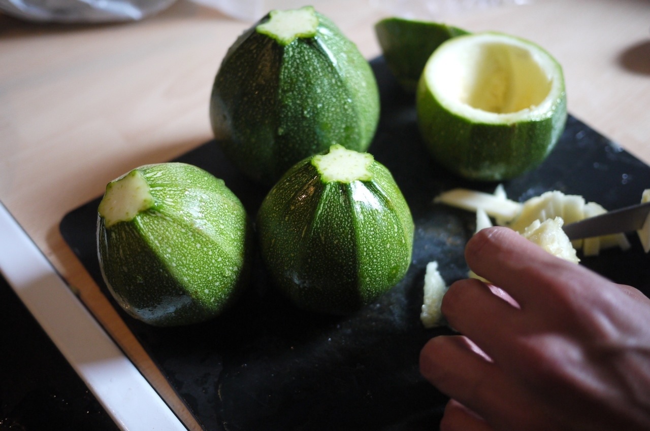 Creuser à l’aide d’une cuillère puis réserver la chair de 3 courgettes. Creuser également un peu les chapeaux.