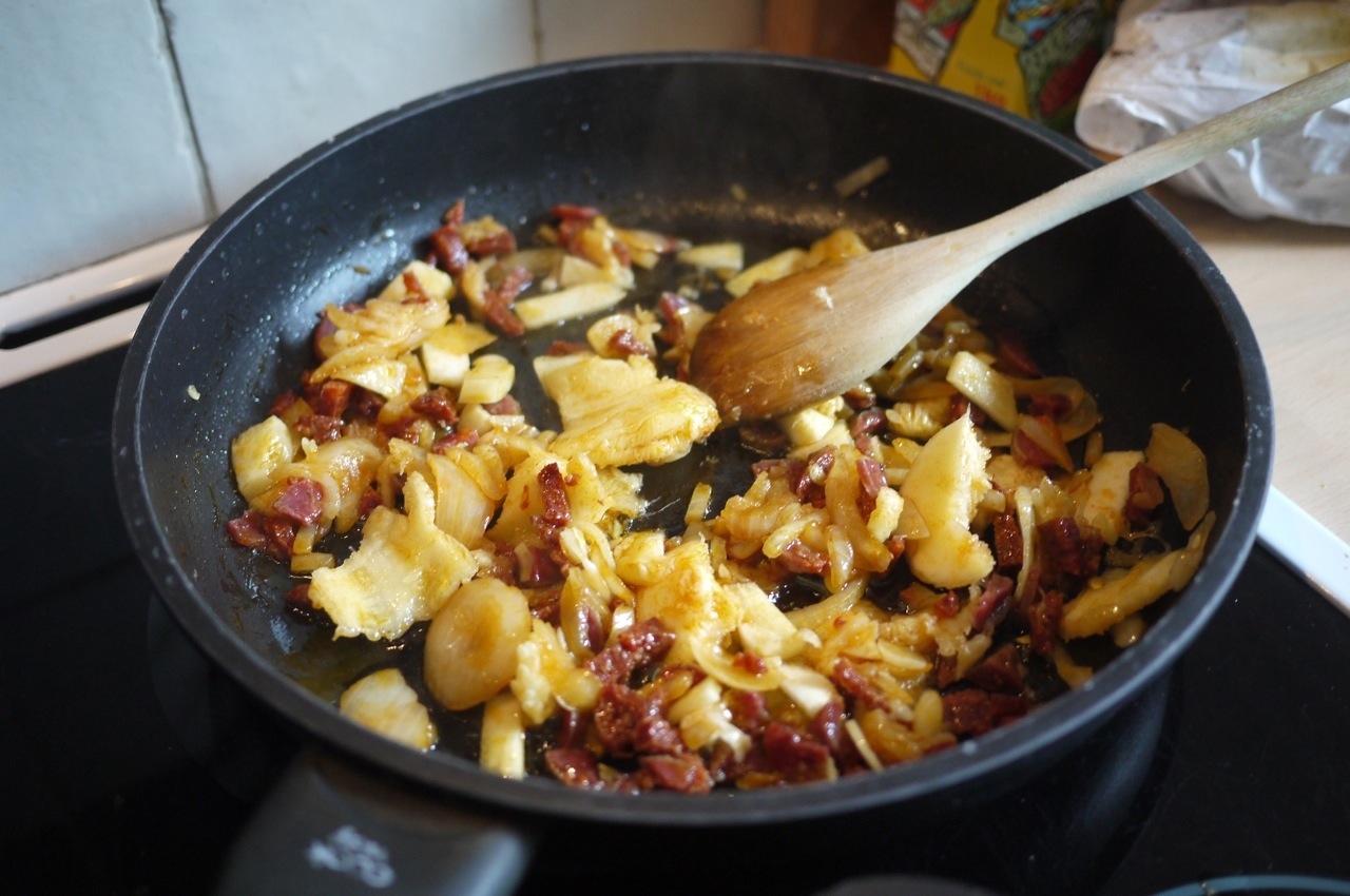 Ciseler l’oignon et couper le chorizo en petites allumettes. les placer dans la poêle à feu moyen/doux pendant 10 minutes, faire réduire l’oignon et croustiller le chorizo …mais pas trop!