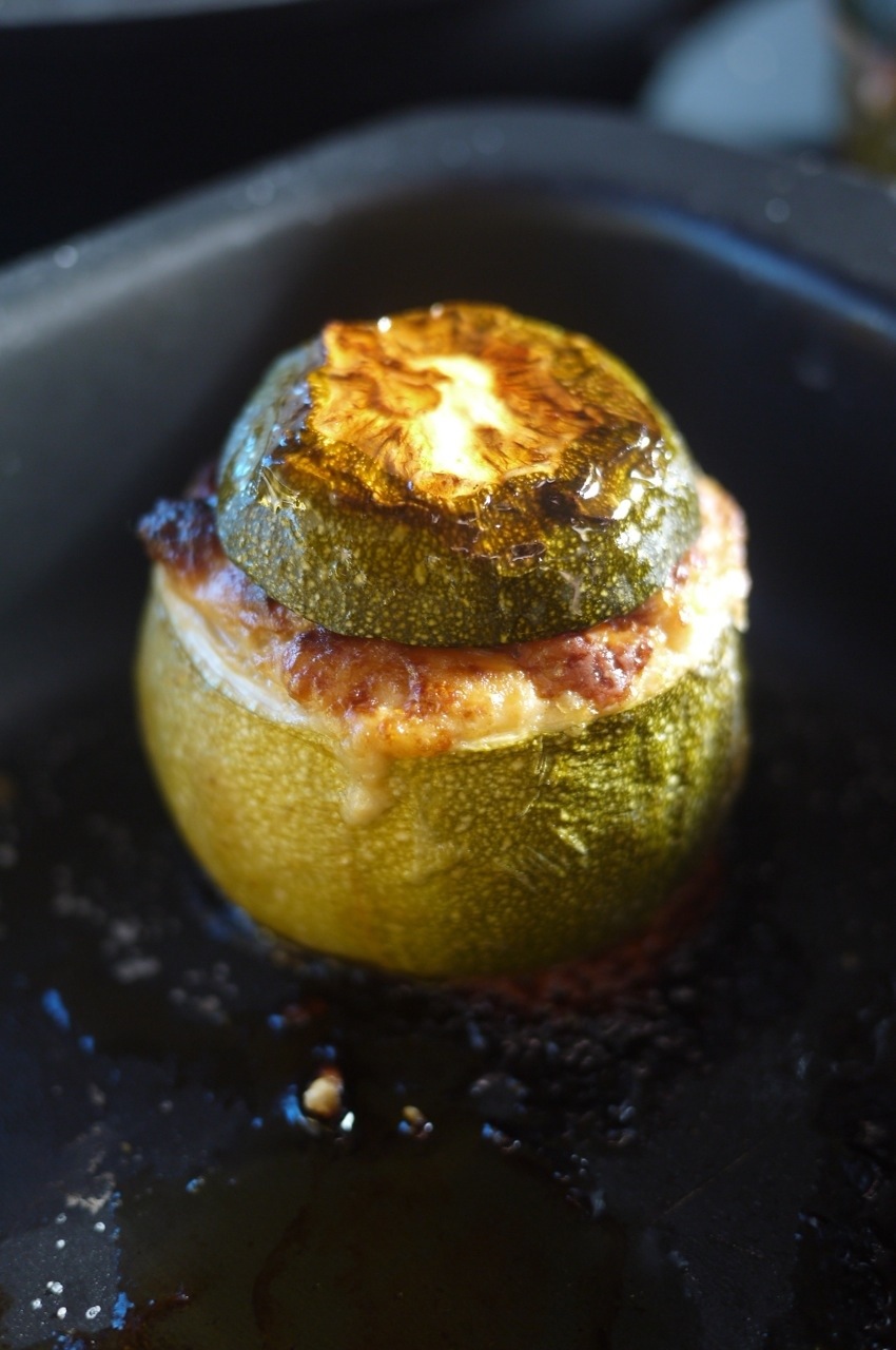 Remplir chaque courgette du mélange. mettre les chapeaux à côté de chaque courgette côté peau contre le plat et remplir également un peu les chapeaux. Saupoudrer chaque courgette d’un peu de parmesan.