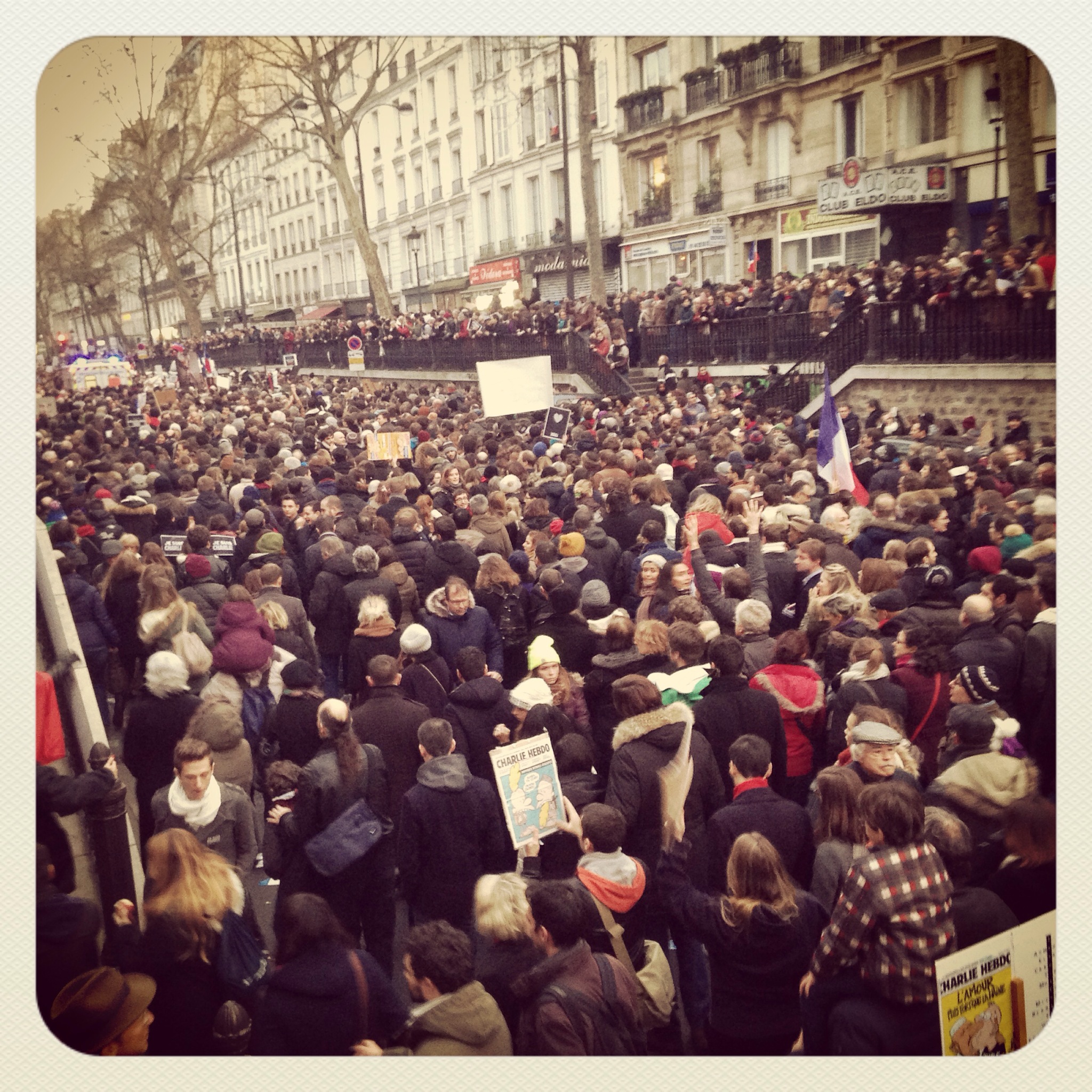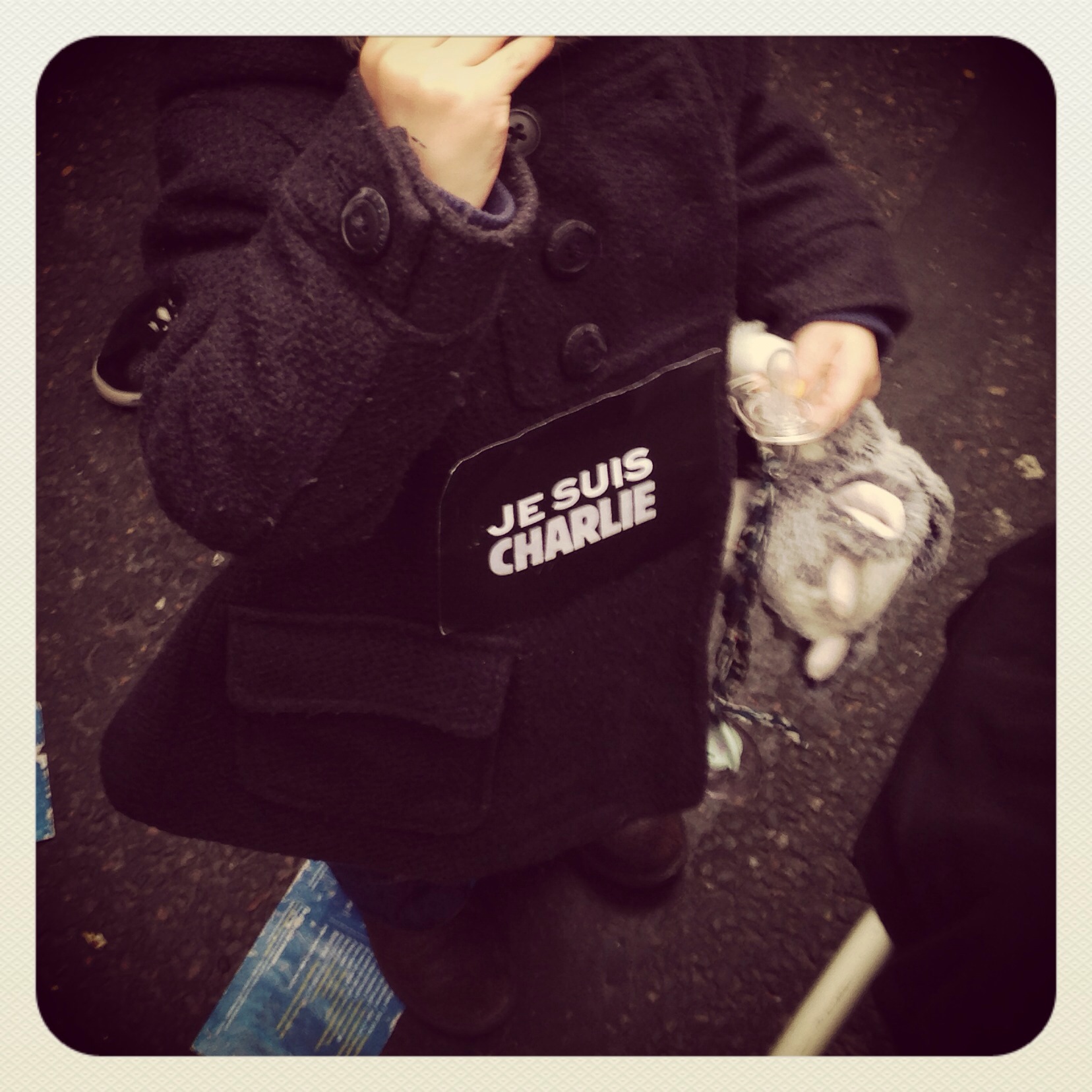 Nous avons attendu que Ma Petite se réveille de sa sieste, et nous avons pris le métro. Nous avons laissé passer une première rame bondée, et puis nous sommes montés dans la seconde. L’ambiance était particulière, pour une fois j’avais la sensation que les voyageurs se regardaient, se souriant, se demandant si eux aussi ils « y » allaient. Une dame à proposer aux filles de s’asseoir près d’elle; Avec une autre nous avons parlé banderoles parce que Ma Grande voulait savoir ce qui était inscrit sur la sienne. Il y’avait des dames voilées, des couples de retraités, des femmes seules, quelques familles, des groupes de jeunes… Nous sommes tous descendus au même endroit pour rejoindre le cortège. Un cortège qui avait peine à se mettre en route tant nous étions nombreux. Une dame a tendu des autocollants « Je suis Charlie » à Ma Grande, qui était plus que ravie: « oh l’autocollant noir et blanc, comme celui de mon maître à l’école, il l’a aussi sur son pull »…