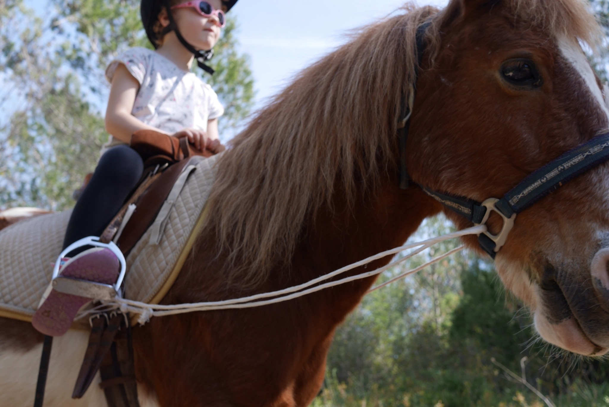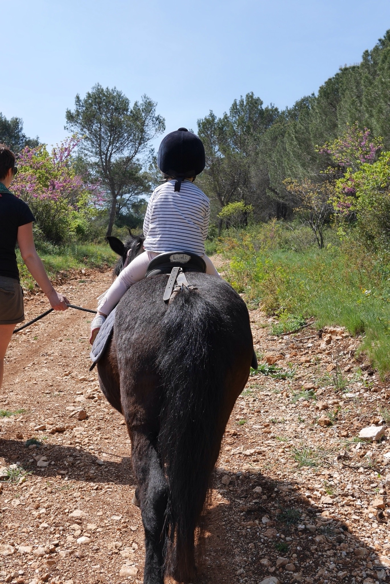 – le poney (comprendre la ballade à dos de poney que nous avons fait ensemble. Elles étaient chacune sur leur poney, et ont pu randonner plus d’une heure dans la garrigue.)