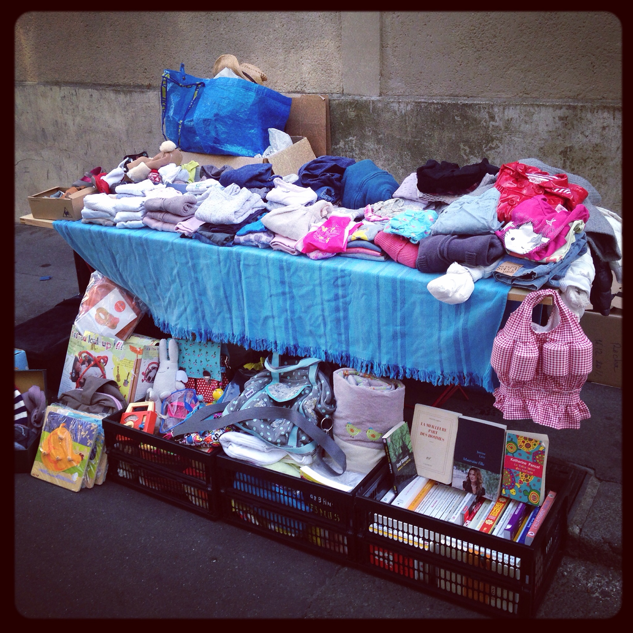 Quelques jours plus tard, je découvrais qu’un vide-grenier était organisé non loin de chez moi, dans mon quartier, et j’ai donc réservé un stand de 2 mètres pour 20€. J’ai préparé cette journée scrupuleusement en triant tous les vêtements de bébé des filles, en sélectionnant des objets « vendables » dans mon placard plein à craquer et dimanche dernier j’ai été « vendeuse de vieilleries en tout genre » toute une journée durant!