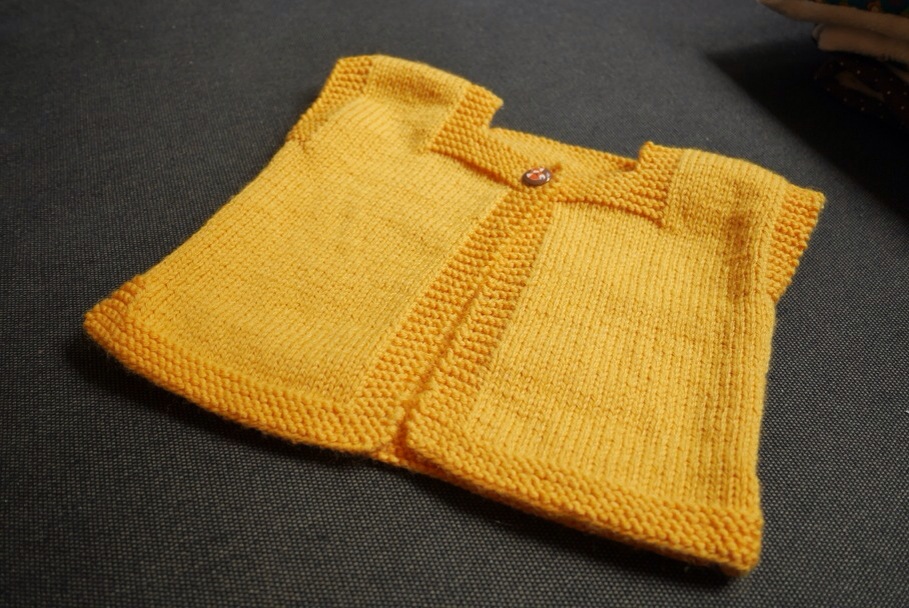 Sa maman m’avait commandé un tricot dans les tons jaune et marron car elle n’est pas adepte du rose bonbon.