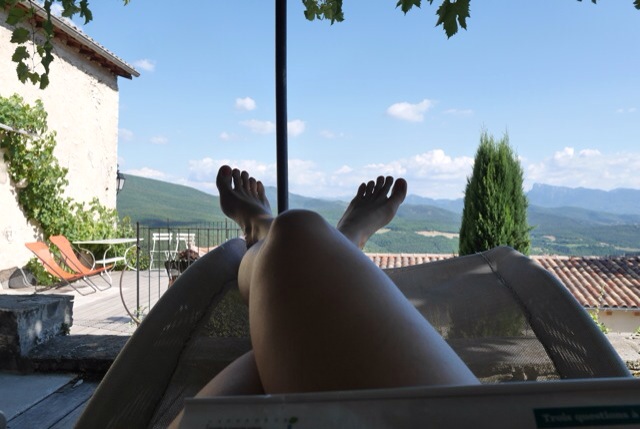 J’avais emmené des livres, des ouvrages de tricot, mais je me surprends à m’allonger dans un transat et à savourer les paysages, les montagnes à perte de vue, le soleil qui me réchauffe la peau. Je prends soin de moi, je prends le temps de ne rien faire à part écouter mon corps, c’est magique.