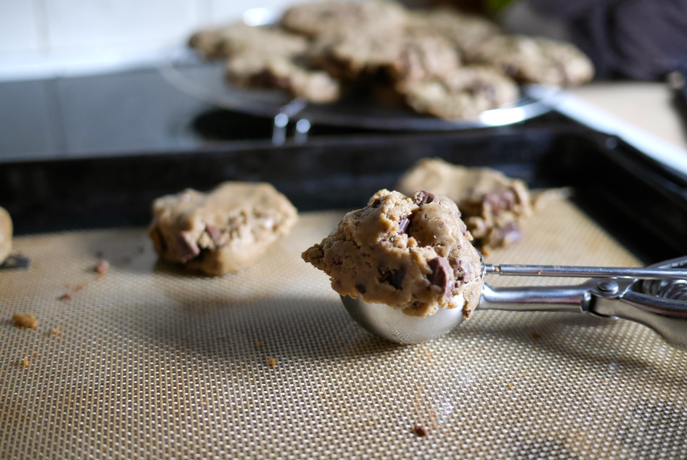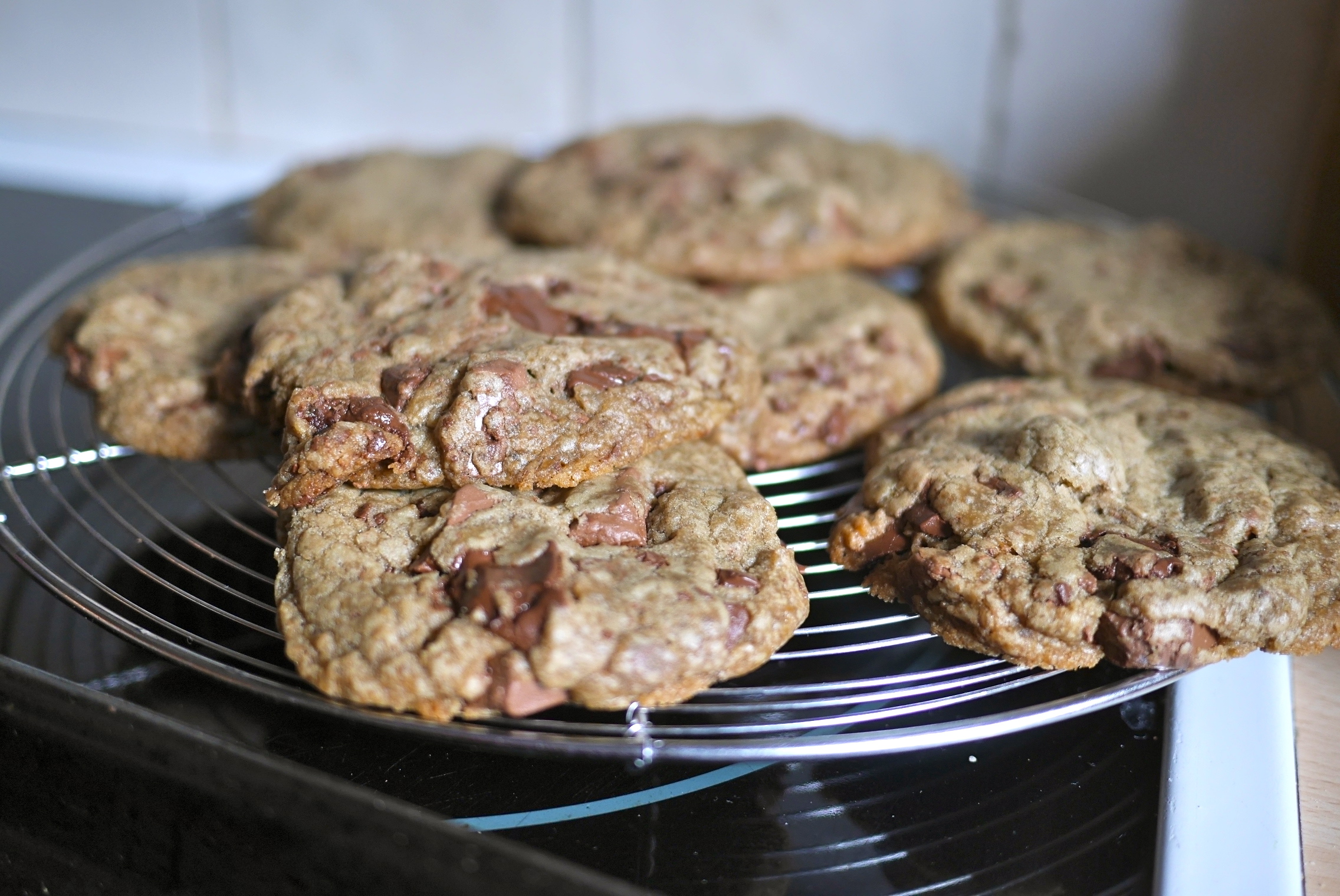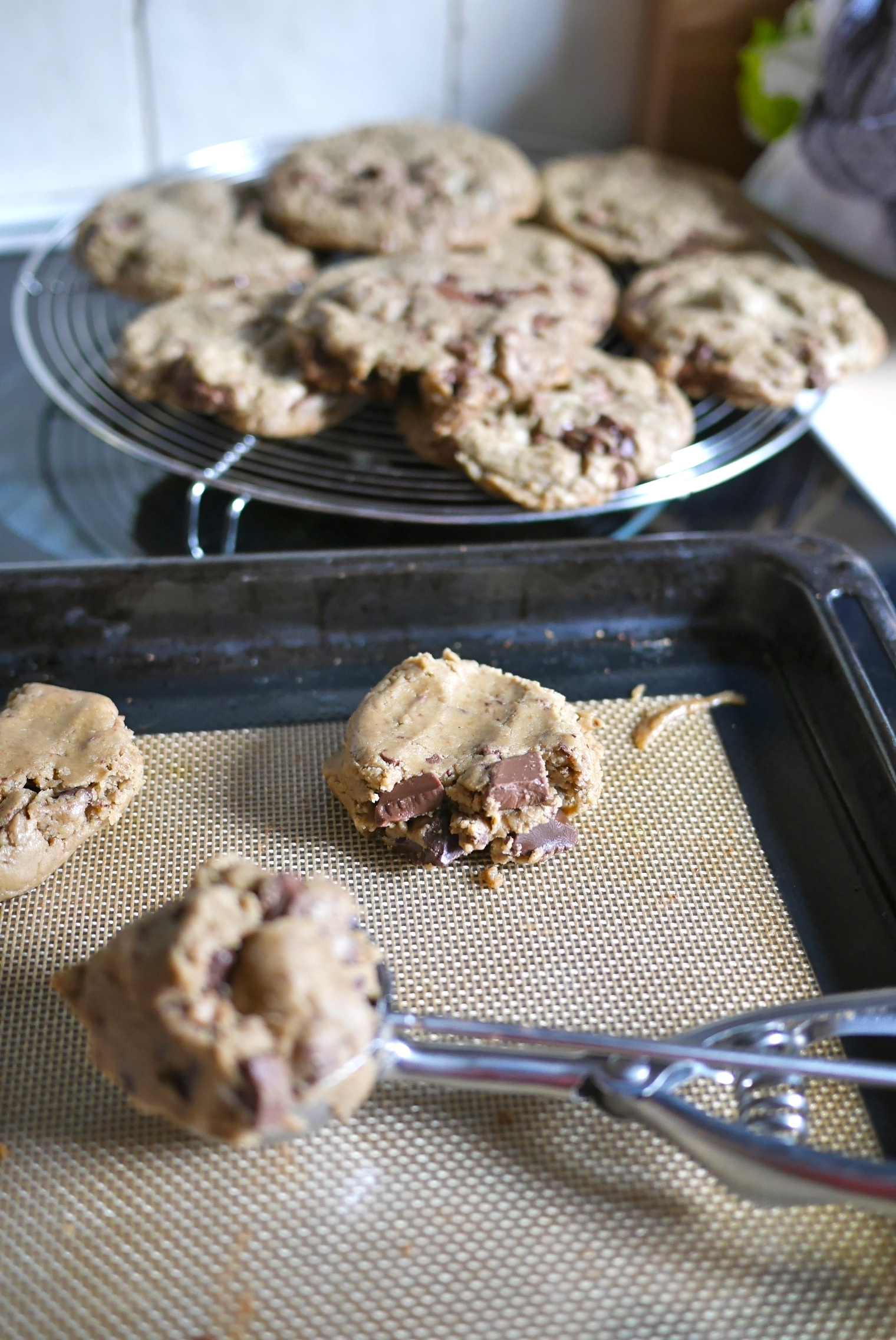 Ce jour là, sur le buffet des gâteaux, j’avais mangé un sublime cookie aux pépites de chocolat! J’ai réfléchi à la recette et à ce que j’avais particulièrement aimé dans ce cookie. J’ai trouvé la réponse: Il me rappelait les cookies mangés aux États Unis ou, plus exactement, la « cookie dough » (pâte à cookies crue) que je grignotais pendant que ma mère d’accueil préparait des cookies. Ces cookies sont presque crus même une fois cuits. C’est un peu particulier et en France on les trouve dans le commerce chez Laura Todd.