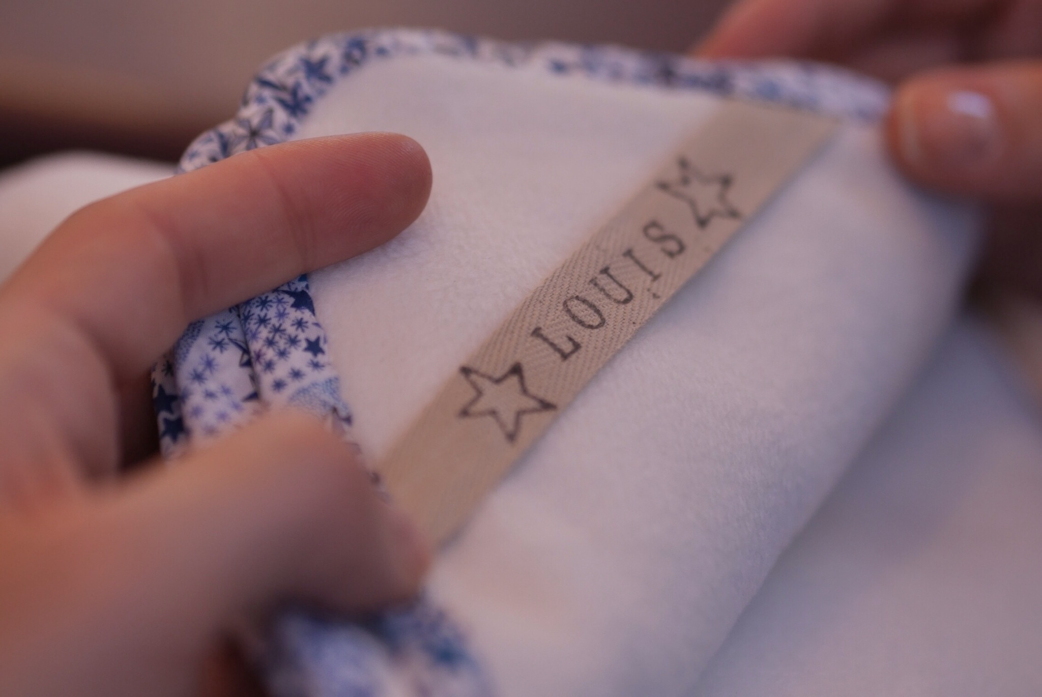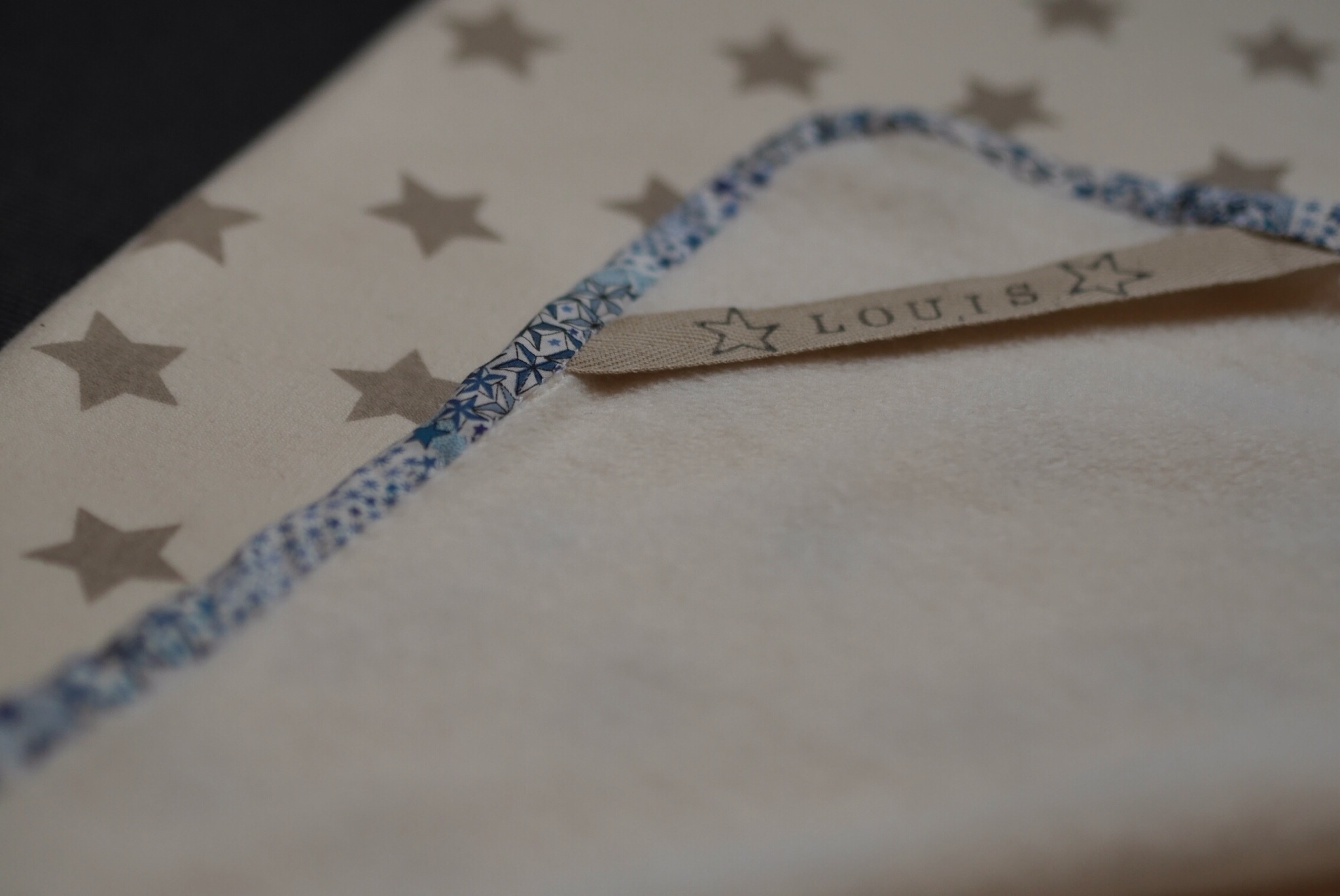 Pour finaliser la couverture, je l’ai personnalisée avec un ruban au prénom de Louis (réalisé facilement avec mes tampons alphabet et mon encre noire spéciale tissu).