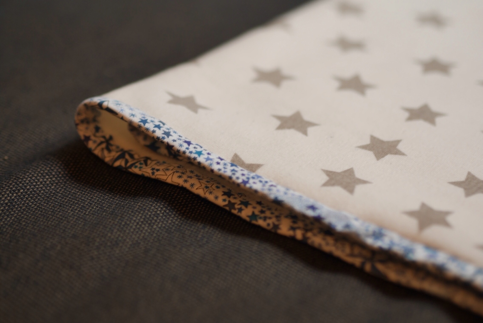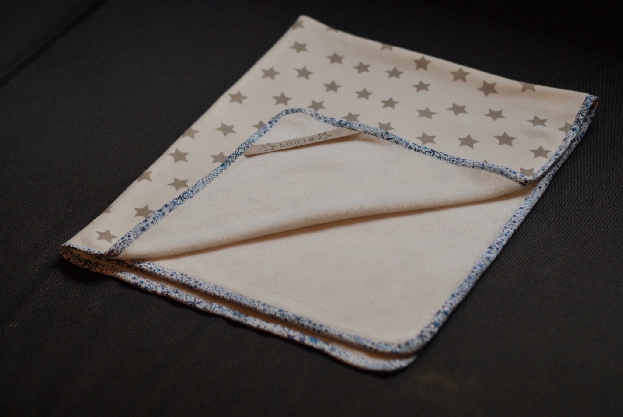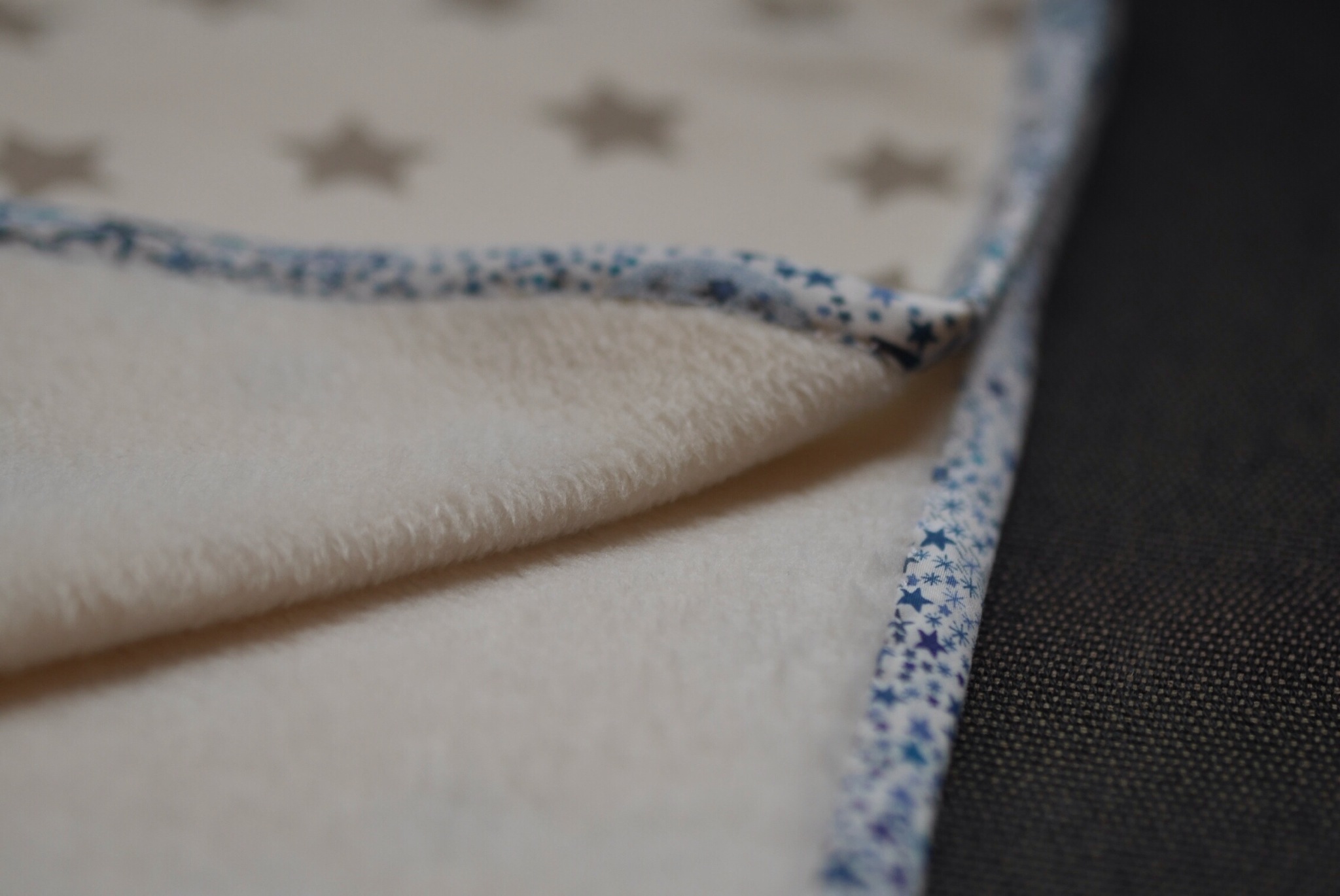 J’aime toujours autant les tissus à motif étoilé. Alors j’ai craqué, en découvrant au Marché Saint-Pierre, un joli jersey tout doux avec des étoiles beiges, doublé en velours uni blanc (taille 90x70cm). Pour le biais, j’avais envie de contraster avec la blancheur du tissu. J’ai choisi un biais en liberty (bien sur!) « Adelajda » étoilé bleu (3.3 mètres de longueur).