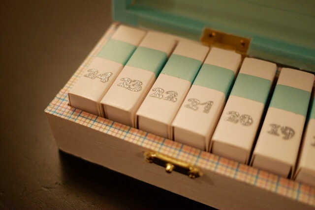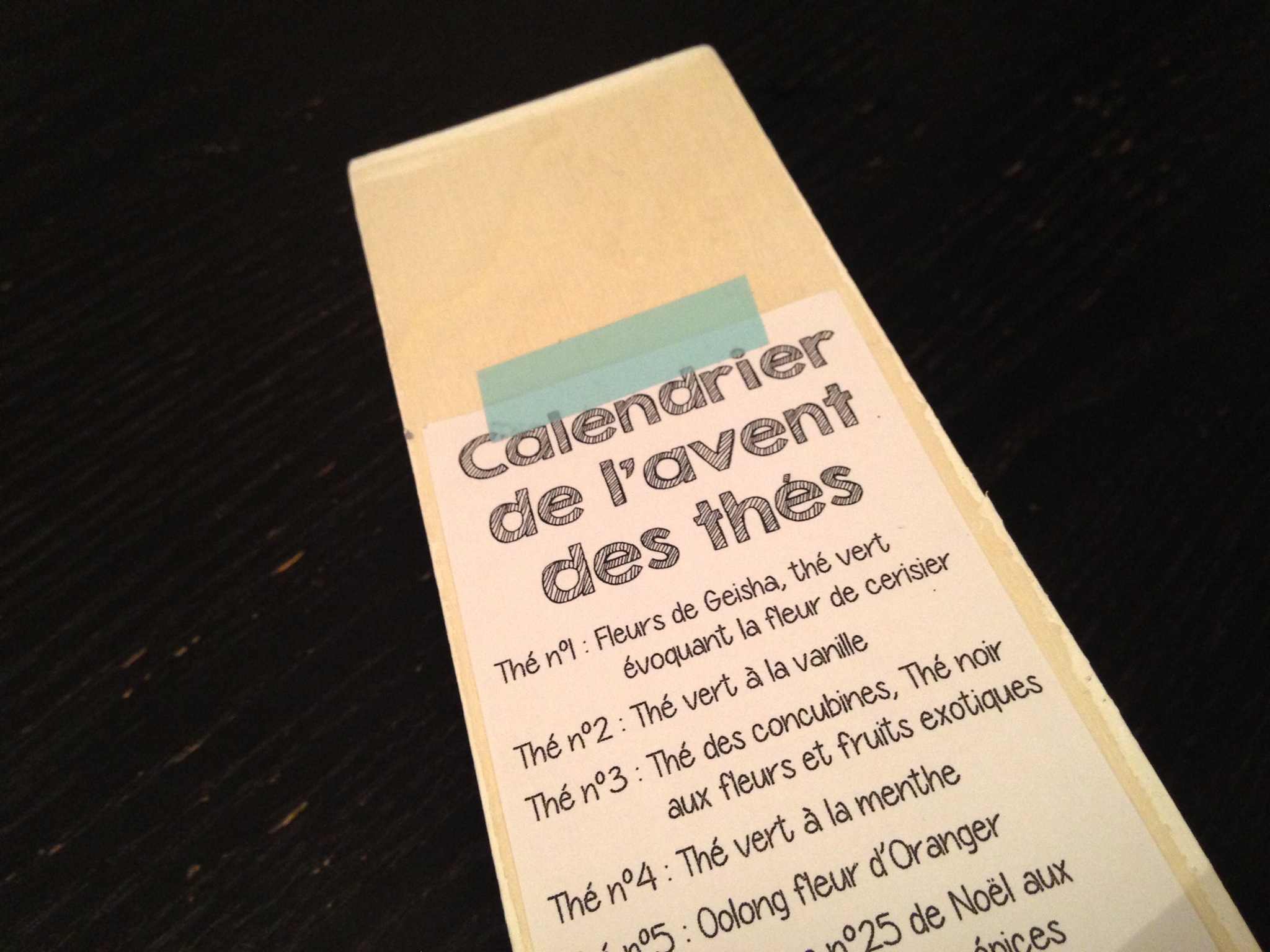 Une grande boîte en bois, contenant 24 petites boîtes numérotées contenant elles-mêmes chacune un sachet de thé en vrac au parfum délicieux. Au dos de la boîte, une liste précise avec quel parfum de thé chaque sachet a été rempli par mon amie.