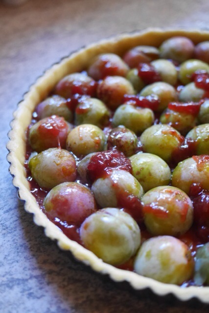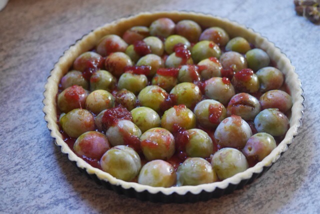 Je pique ma pâte étalée dans le moule et j’y mets une couche de confiture (fraise ou framboise) ensuite j’y place mes prunes coupées et je saupoudre généreusement de sucre pour contrebalancer l’acidité des fruits.