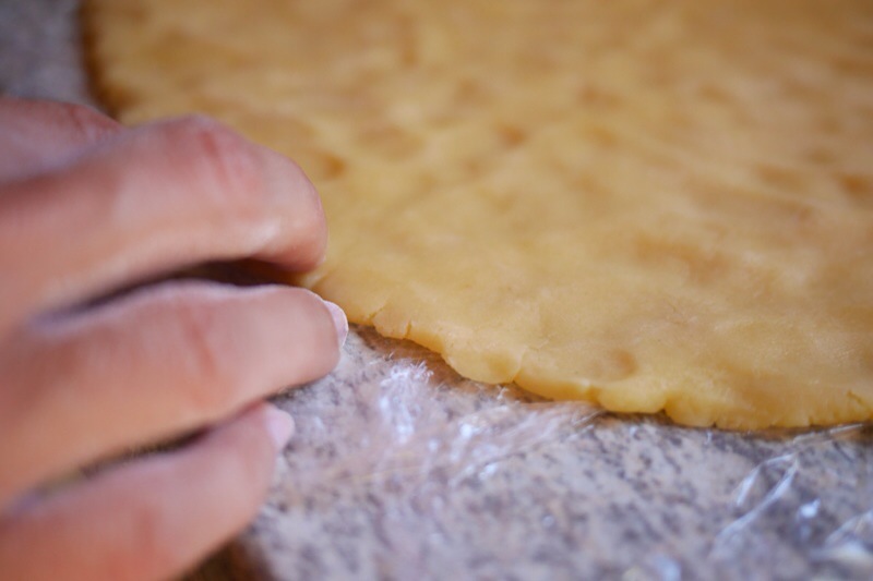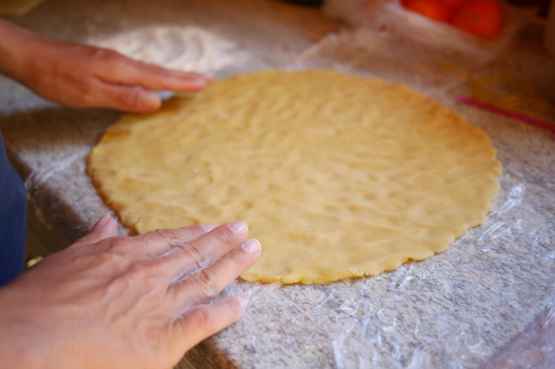 L’été dans les maisons de vacances je n’ai pas forcément de rouleau à pâtisserie mais j’adore étaler la pâte à la main. Je place deux grands morceaux de films plastique (cellofrais) sur mon plan de travail et j’y place mon pâton de pâte, je l’étale ensuite doucement à la main comme de la pâte à modeler jusqu’à obtenir un rond de la taille de mon moule.