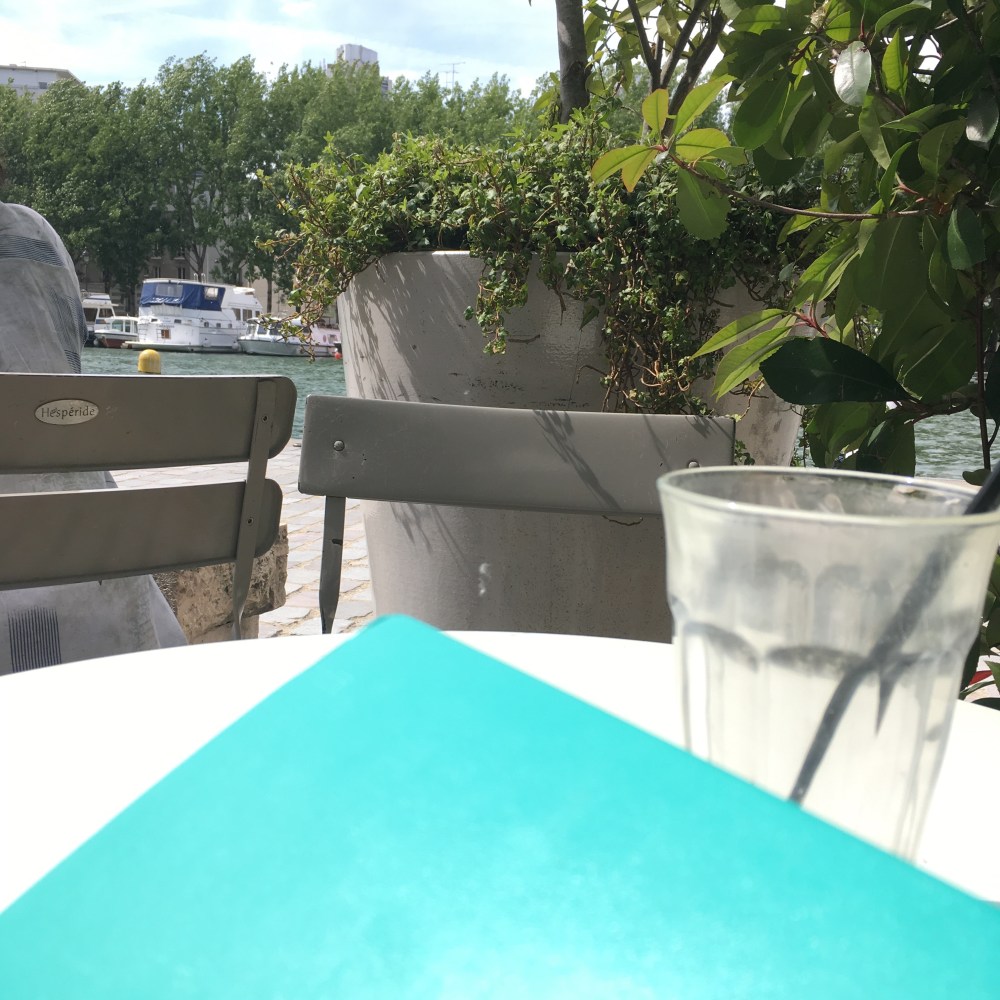 Assise à la terrasse d’un café au bord de l’eau, je regarde la neige tomber.