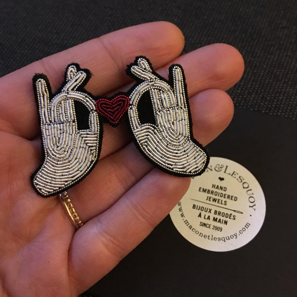 – une jolie broche brodée, qui parle d’amour, de liens, de cœur sur la main