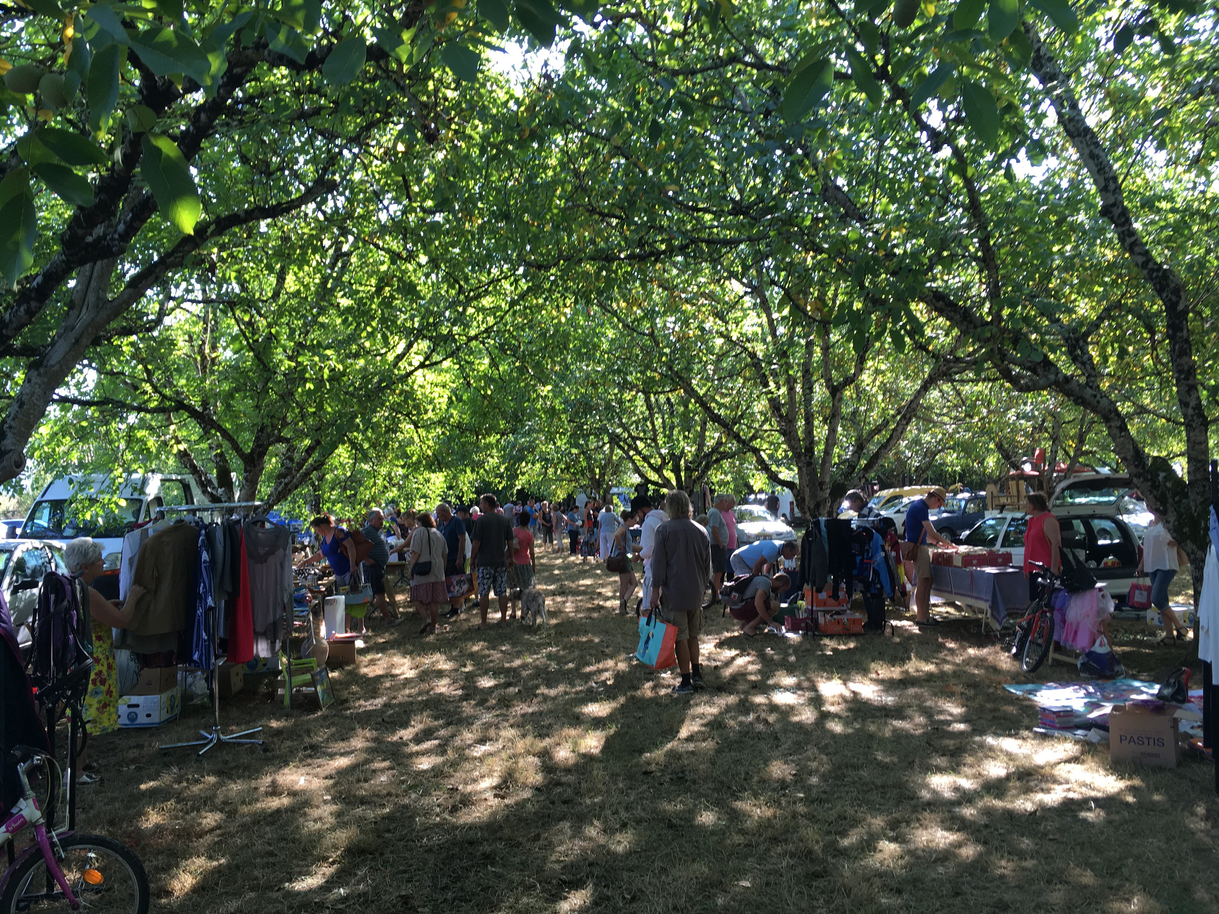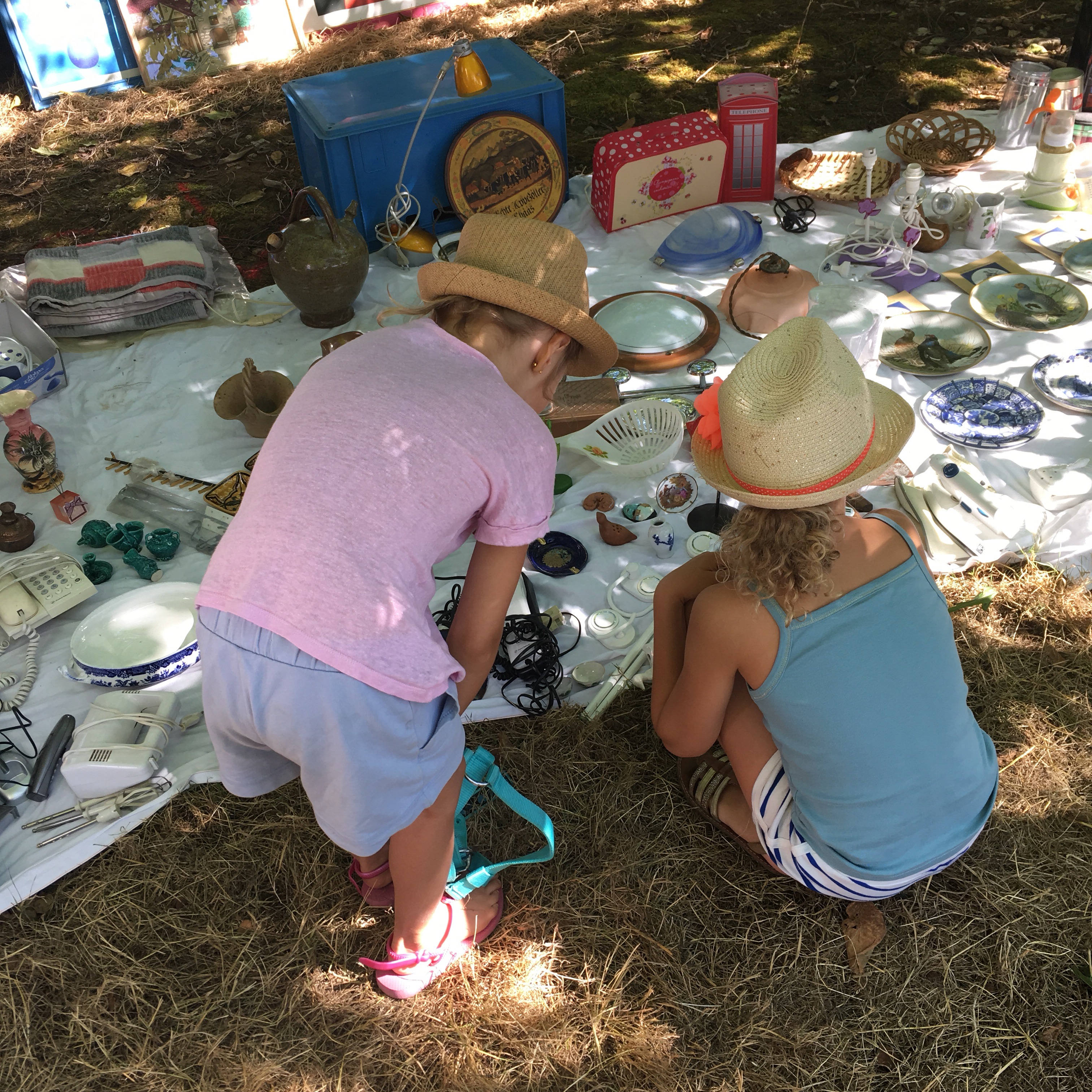 Elles ont quémandé quelques pièces à droite et à gauche. Un euro auprès de leur mamie, un euro auprès de leur tata, un autre auprès de leur tonton… Trois euros en poche pour aller dénicher quelques trésors. La brocante du village c’est un peu en train de devenir notre rituel annuel, je l’aime ce vide-grenier car tout s’y passe à l’ombre des noyers.